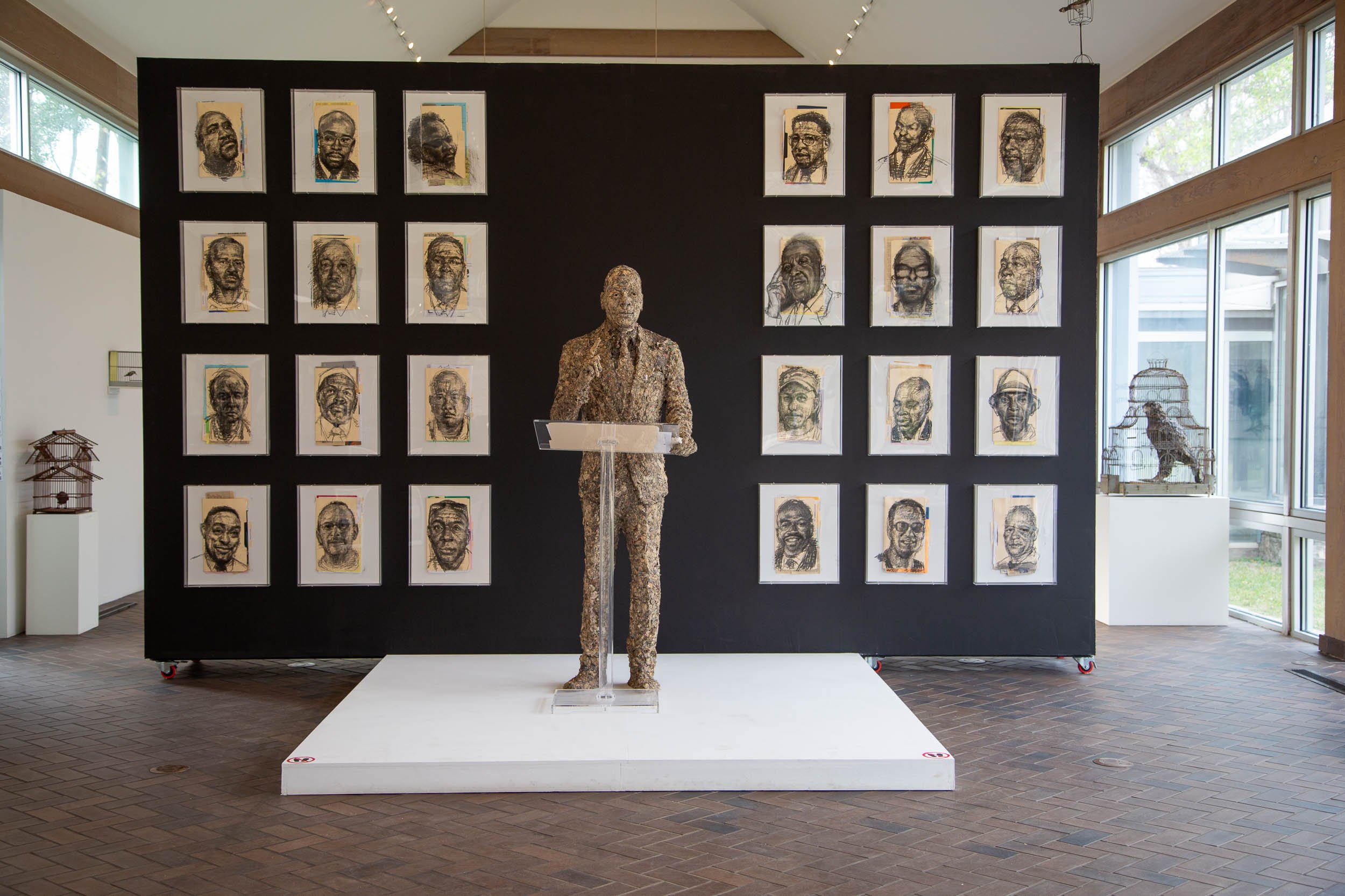 Sedrick Huckaby’s life-size sculpture of Craig Watkins greets visitors. (Michelle Pitcher)Watkins’ sculpture is made of issues of the Dallas Morning News and Fort Worth Star-Telegram, hometown papers for the former DA and the artist. UMLAUF executive director and curator Katie Robinson Edwards said his charcoal portraits carry another layer of meaning, too. “Charcoal is actually burnt wood, so also kind of a medium that has a lot of history. But it’s also pretty flaky and it can be erased,” Robinson Edwards said. “And to me, erasure is a huge part of the show—stories that are impermanent.”