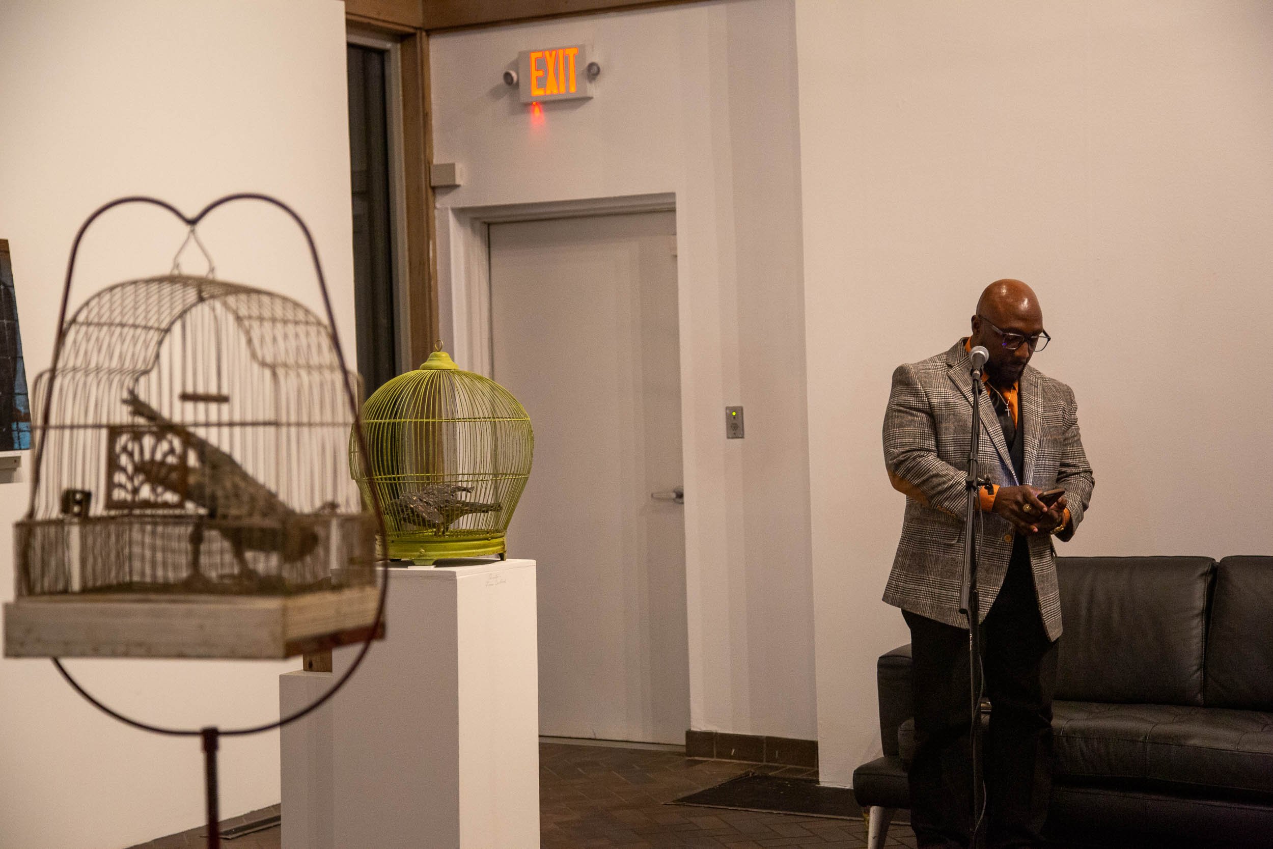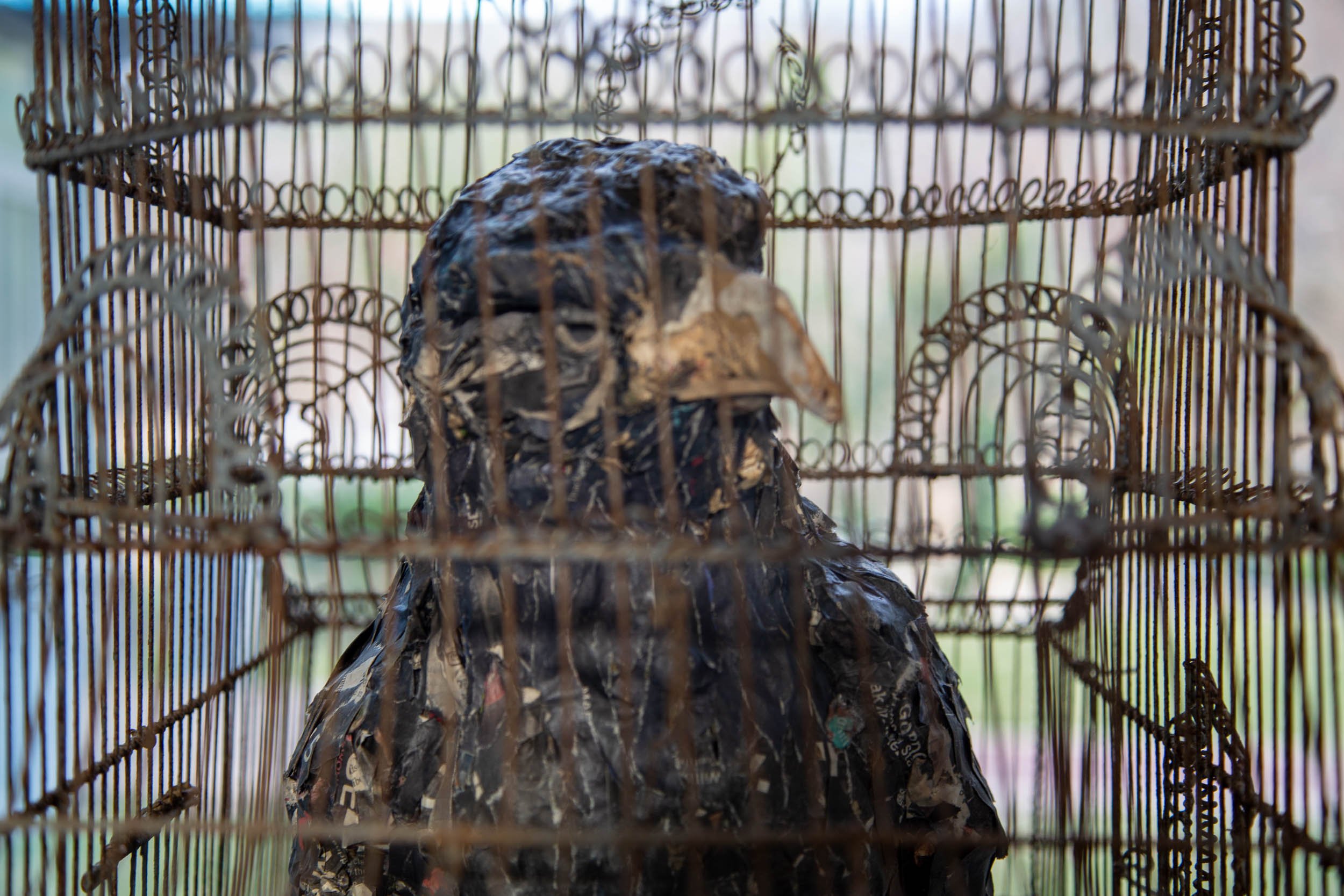 The exhibition gets its name from a collection of paintings and of papier-mâché birds, which Huckaby arranged in undersized vintage cages. Each bird has a name, based on someone Huckaby knows: Antwon the black vulture, Big John the northwestern crow, Shaniqua the black drongo. Many are mid-motion, but all seem to strain against their confinement.