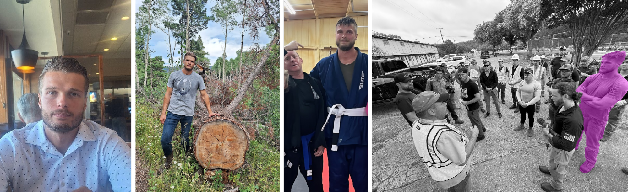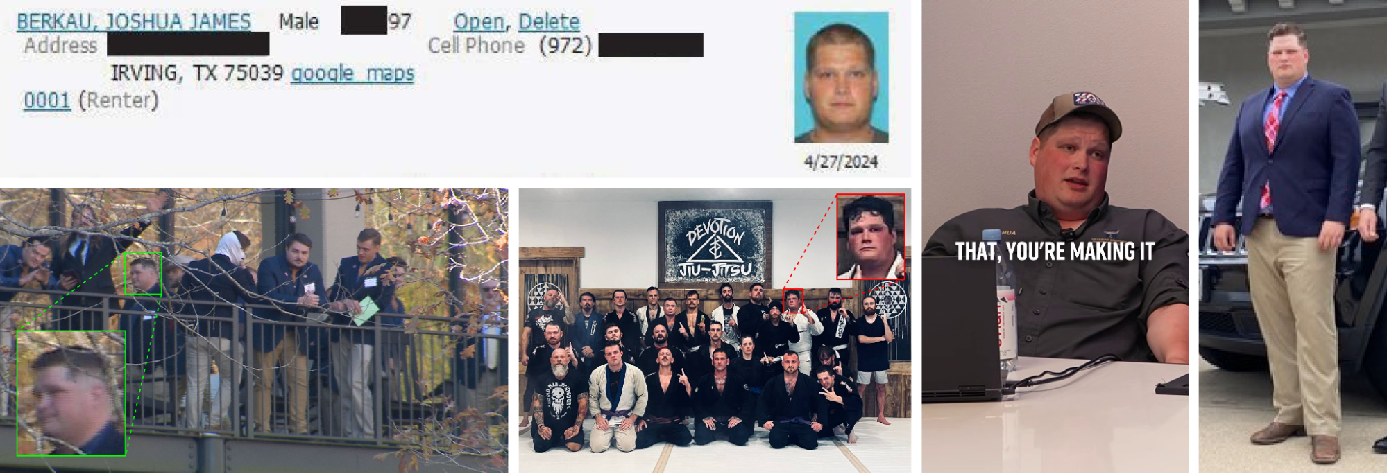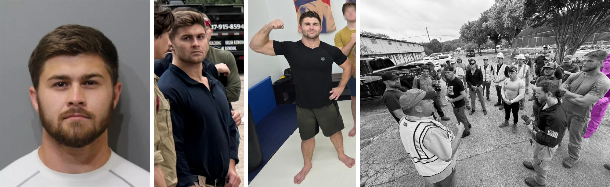 Joshua Berkau, clockwise from upper left: screenshot of police record, frame from video posted to Cameron Schronk’s Instagram page, crop of old staff picture from Veteran Brothers website, picture posted to Devotion Jiu-Jitsu Telegram channel, picture of Berkau standing with a group including Patriot Front members at the white nationalist American Renaissance conference (Police records, Instagram, Veteran Brothers website, Telegram, Bluesky)The River Inn photo also included: Otey, the operator of Blue Collar Tree & Junk Removal; Graham Whitson, another Coeur D’Alene arrestee whom the SPLC has described as part of Rousseau’s inner circle; Rhett Loftis, whom the Observer previously identified as the leader of a white nationalist fight club that, according to the SPLC, reports to Morris and Rousseau; and Tristan Rettke, who has participated in a Russian street fighting club that expanded to the United States with the help of Patriot Front, according to The Guardian. Otey and Loftis confirmed participating in the relief but did not confirm appearing in the photo; Rettke did not respond, and the Observer was unable to reach Whitson.