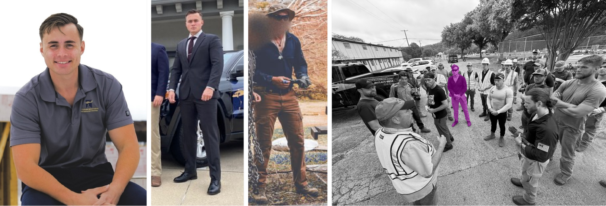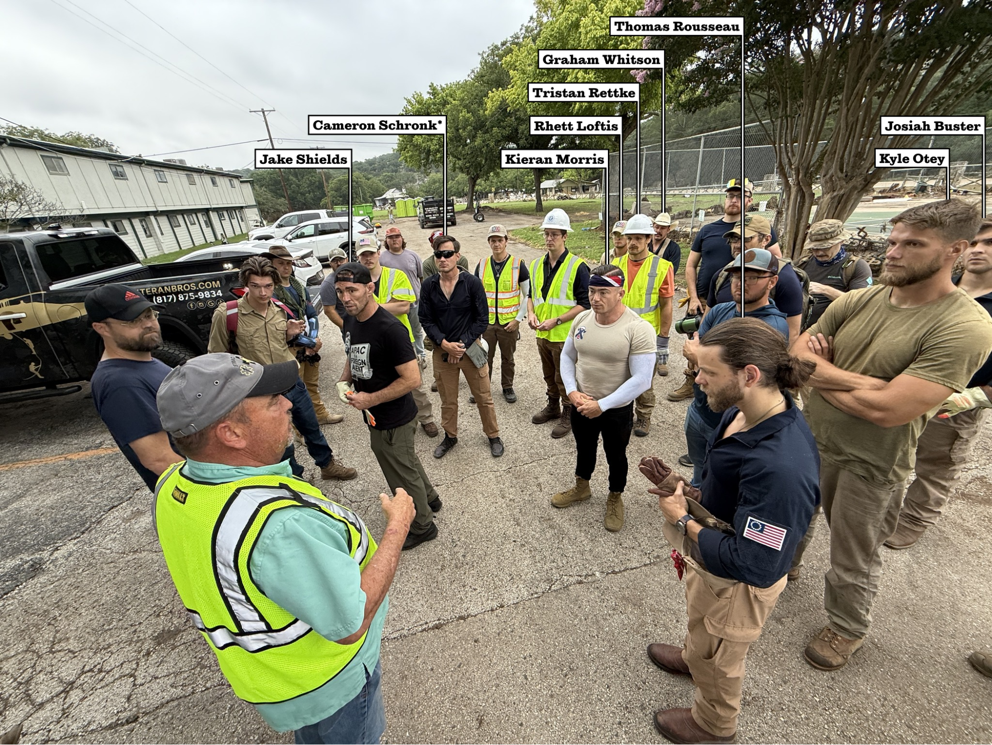 Encroaching in from the left side of the River Inn photo is a pickup bearing the logo and contact information of Veteran Brothers Roofing & Restoration, a Fort Worth-based contractor. Near the photo’s center, a man resembling the company’s owner, Cameron Schronk, stands beside a known Patriot Front member and behind Jake Shields, the Holocaust-denying podcaster whose shirt reads “AIPAC Is a Foreign Agent.” Schronk confirmed to the Observer participating in the disaster relief using his pickup; facial recognition software matches other photos of him to the River Inn photo; and a source, who requested anonymity to avoid possible retaliation but has reason to be able to identify Schronk at the time of the photo, identified the man as Schronk—but Schronk denied appearing in the photo. Schronk also denied being a member of Patriot Front; at least two people who currently work or worked for his company have been identified as Patriot Front members in court documents or news reports.