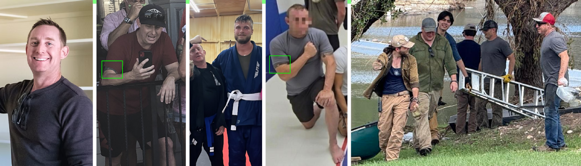 Kieran Morris, left to right: mugshot from Coeur d’Alene arrest, frame from video posted to Cameron Schronk’s Instagram, crop of picture from old staff photo on Veteran Brothers website, picture of Lone Star Active Club gym posted to Morris’ Telegram, Morris highlighted in River Inn Facebook photo (Mugshot, Instagram, company site, Telegram, Facebook)A Google Maps account named Kyle Otey also left a review for Charvold Homes in May 2025 saying, “John is great! Highly recommend charvold homes!”