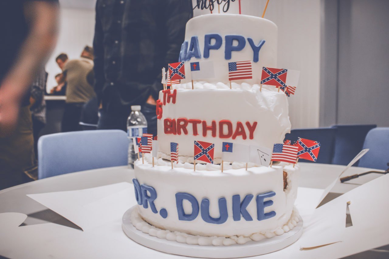 The David Duke birthday cake (Telegram)Verdier denied that his company is part of a network that benefits Patriot Front members, but he said: “I have given some Pro-White businesses jobs at some of my personal houses.” Asked to clarify whether Veteran Brothers, which he said he hired to work on homes he personally owns, was one of those businesses, he said: “Veteran Brothers as a business is not Pro-White but Pro-Whites work there.”